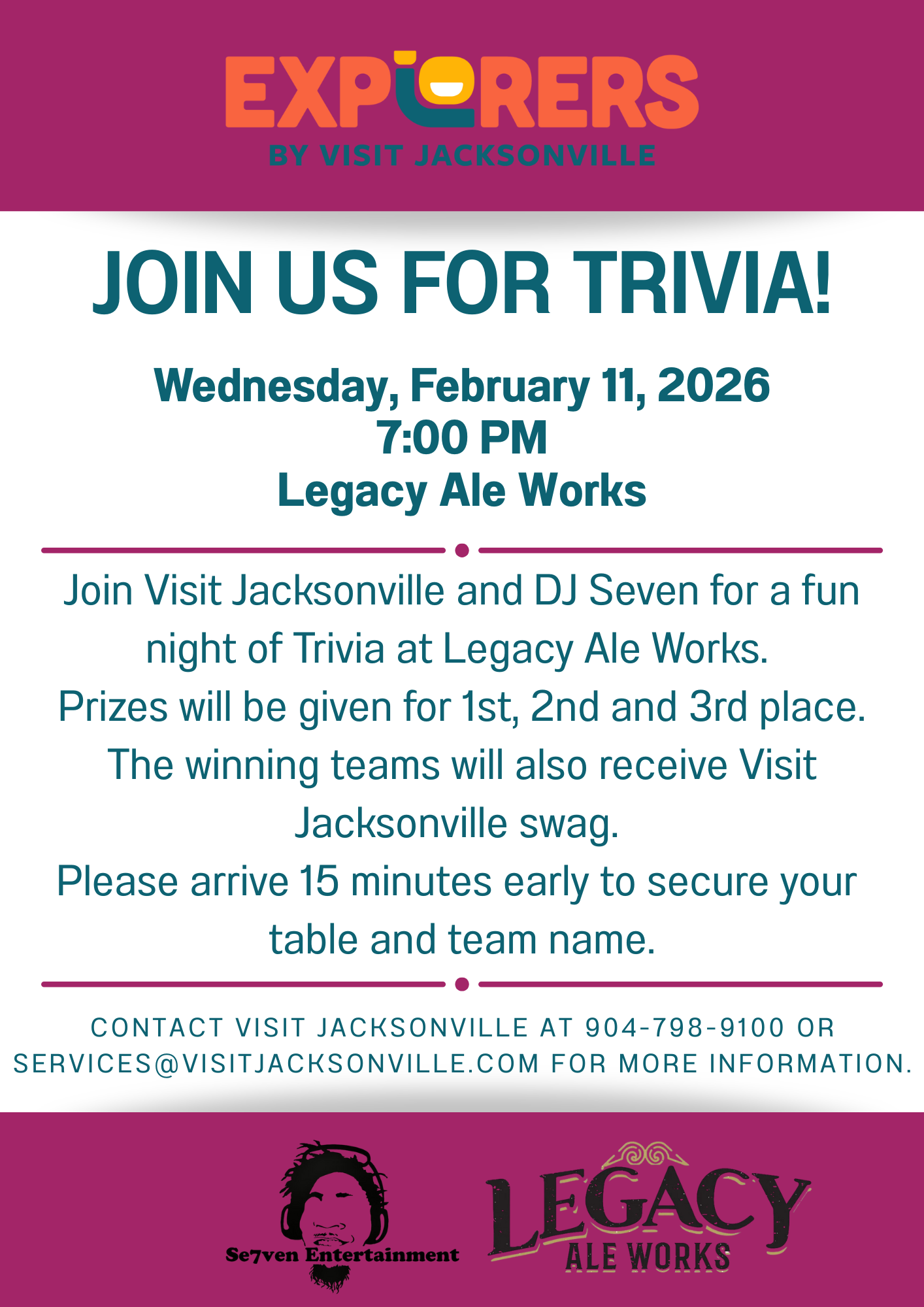 Join Visit Jacksonville and DJ Se7ven for free trivia at Legacy Ale Works! Prizes will be awarded to 1st, 2nd and 3rd places!
