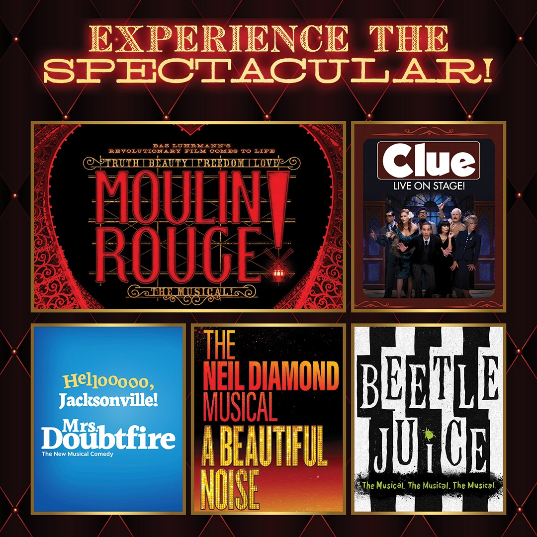 | 5-show Broadway in Jacksonville Season Subscriptions Packages start at $232 and includes Clue, Mrs. Doubtfire, Moulin Rouge! The Musical, A Beautiful Noise: The Neil Diamond Musical and Beetlejuice Packages start at $249 for 5-shows | |